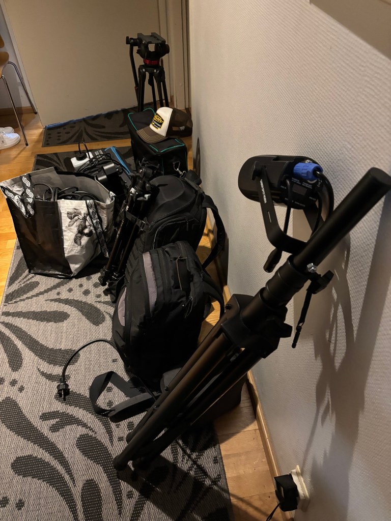 Kuvauksia varten nappaan aina mukaan setin valoja, dronen, kameroita ja tarpeen mukaan savukoneet. Kameroille videokuvausjalusta ja toiselle kameralle mekaaninen kuvan vakautin ( gimbal ) jotta saadaan laadukasta ja vakaata kuvaa liikkuvasta kamerasta. Lamppuja on nippu akkukäyttöisiä, millä saadaan tarvittaessa koko tila valaistua, tai tuotua haluttua tunnelmaa paikalle. Valoiksi vien usein myös muutamia pieniä valolähteitä jotka saavat näkyä, eli kynttilöitä ja ledilamppuja. Lisäksi paikalla yleensä on jotain käyttökelpoista valmiiksi. Tossa on vielä yksi kapeakeilainen valonheitin, millä oli tarkoitus tehdä kikkaa taustalla olevan usvan kanssa, mutta paikan ilmastointi imi usvat… Suunnitelmat muuttuu aina.
